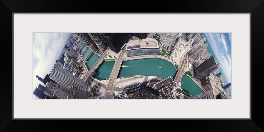 <p>A wide angle photograph taken from an aerial view of the Chicago skyline with the river running through it.</p>