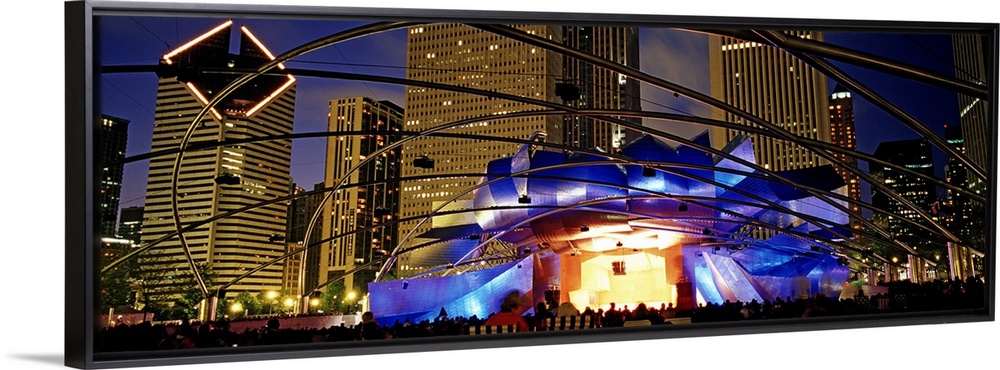 <p>Wide angle photograph taken of an elaborate stage with a performance at night in the city of Chicago.</p>