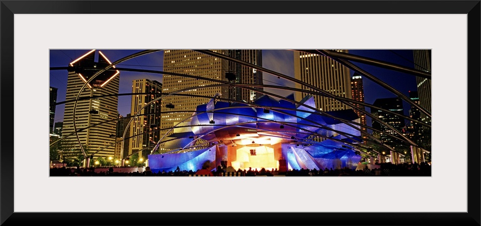 <p>Wide angle photograph taken of an elaborate stage with a performance at night in the city of Chicago.</p>