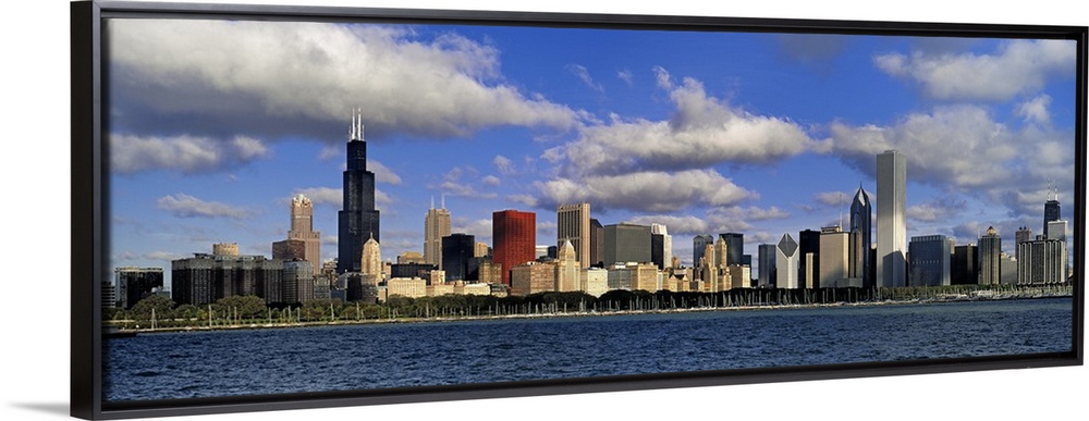 <p>Large panoramic photograph of downtown Chicago, Illinois (IL) on a suny day with large clouds in the sky and Lake Michigan in the foreground.</p>