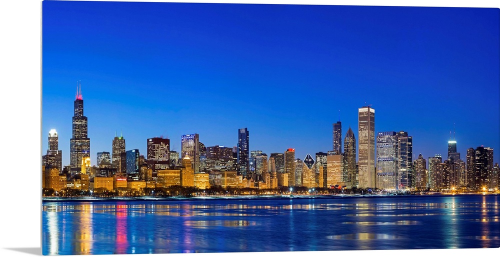 <p>USA, Illinois, Chicago. The City Skyline and a frozen Lake Michigan from near the Shedd Aquarium.</p>