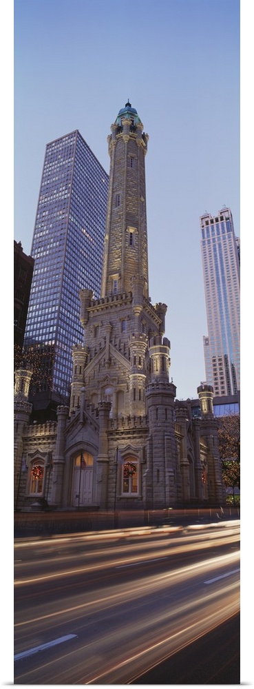 <p>Vertical panoramic photograph of skyscrapers and tall buildings along city street.</p>