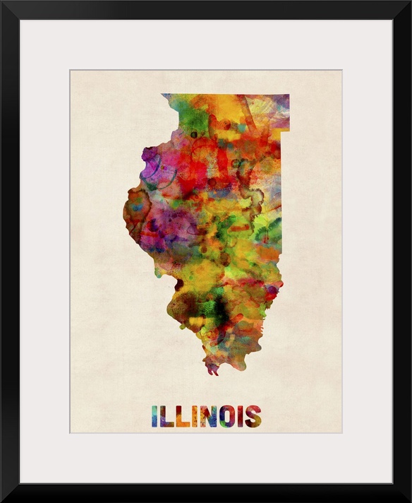 <p>Contemporary piece of artwork of a map of Illinois made up of watercolor splashes.</p>
