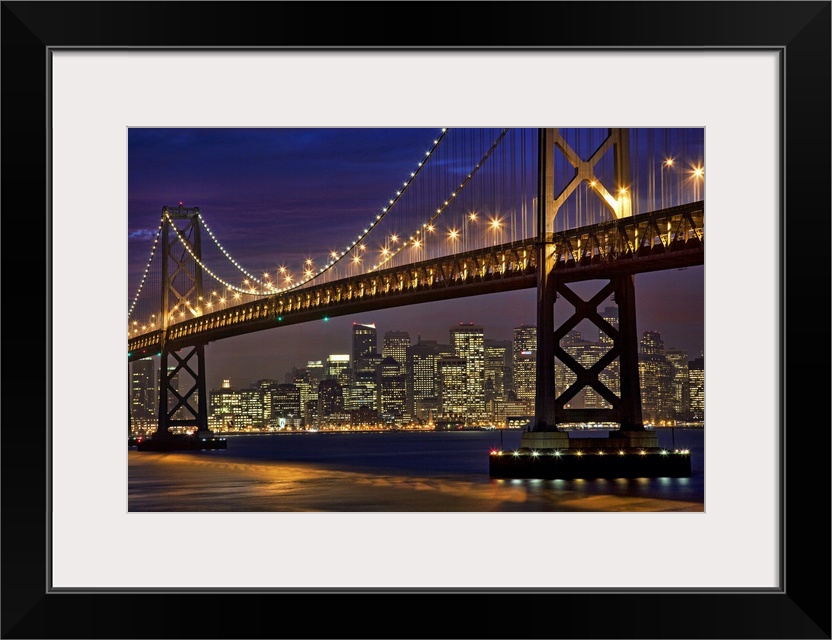 <p>The Bay Bridge is shining brightly under a night sky with the San Francisco skyline shown in the background.</p>
