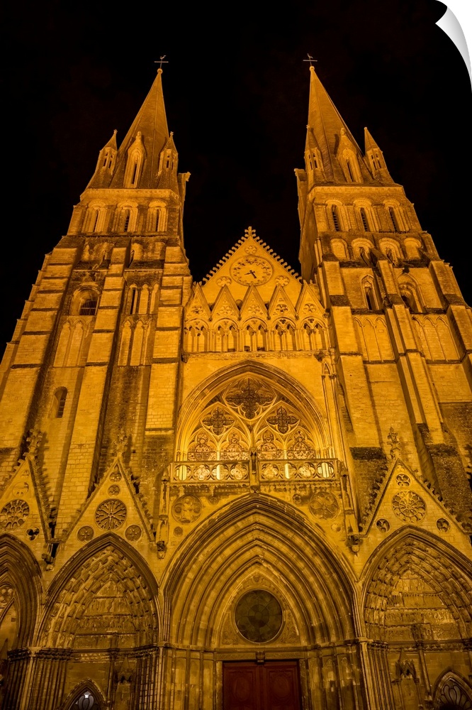 <p>Illuminated Bayeux Cathedral facade Towers Our Lady of Bayeux Church, Bayeux, Normandy, France. Catholic church consecrated by King William the Conqueror in 1077.</p>