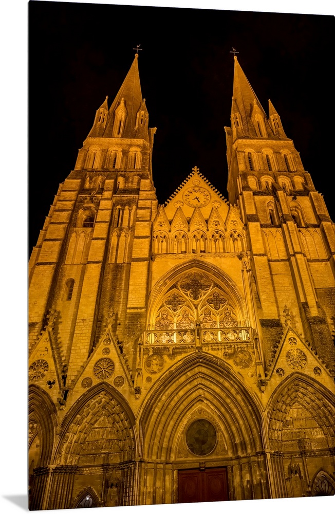 <p>Illuminated Bayeux Cathedral facade Towers Our Lady of Bayeux Church, Bayeux, Normandy, France. Catholic church consecrated by King William the Conqueror in 1077.</p>