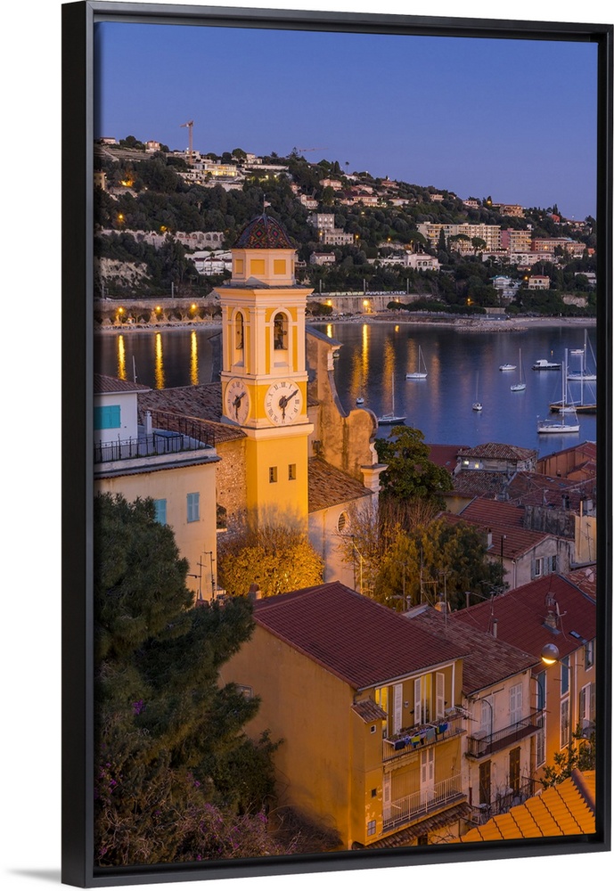 <p>Illuminated Saint-Michel Church at dusk, Villefranche sur Mer, Alpes Maritimes, Cote d'Azur, French Riviera, Provence, France, Mediterranean, Europe</p>