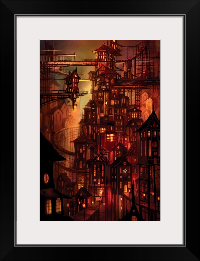 <p>Science fiction artwork of a city illuminated in a red glow which has buildings stacked upon each other creating a sort of castle.</p>