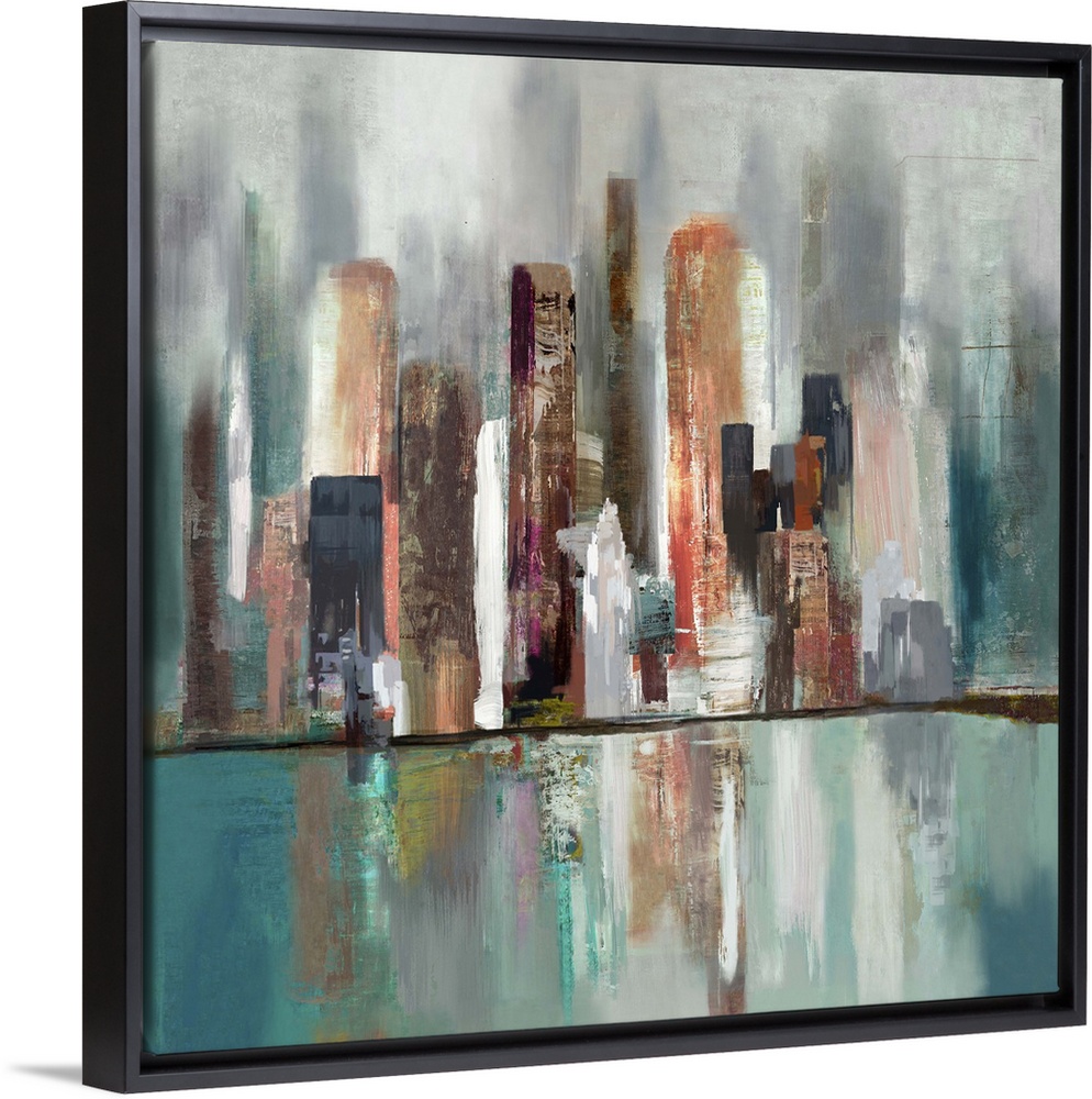 <p>Contemporary home decor art of an abstract skyline of tall architectural structures.</p>