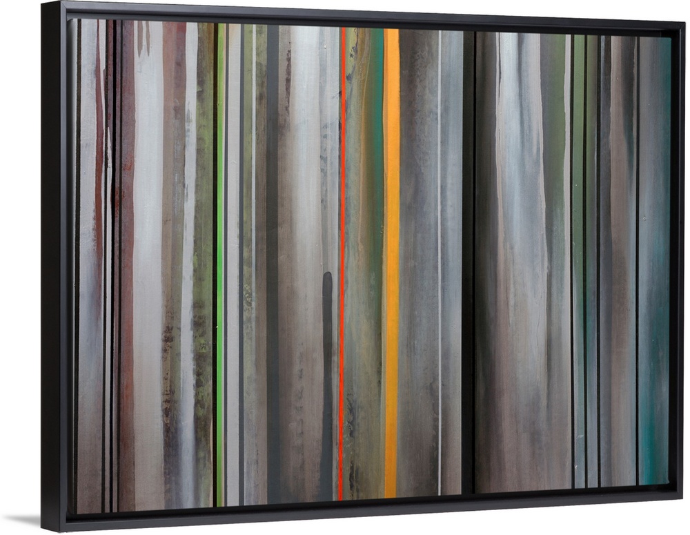 <p>Landscape, oversized contemporary painting of numerous vertical lines, side by side, in a variety of colors and thicknesses. Painted with different brushstrokes, and several runs or drips.</p>