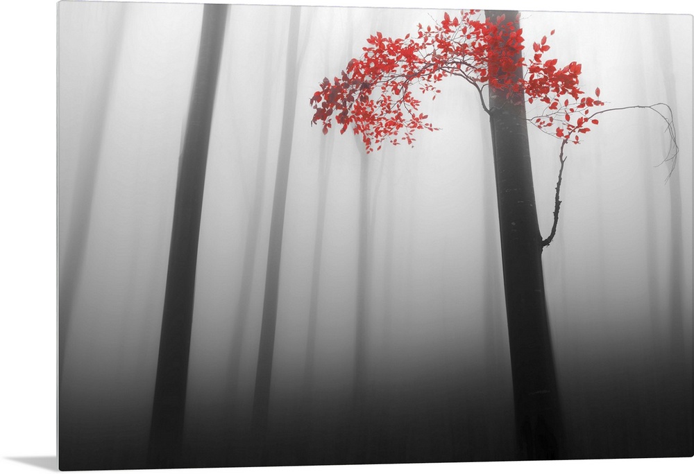 <p>A forest with dense fog and thin dark trees, with only one branch of vivid red leaves.</p>