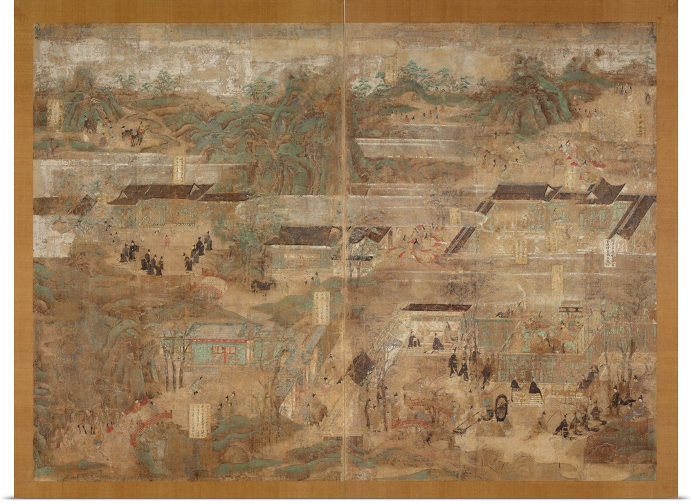 <p>1069. Color on figured silk. 190 x 140 cm (74.80 x 55.12 inches). Tokyo National Museum, Tokyo, Japan. Two (one pair) of ten panels depicting places and events related to the life of Prince Shotoku. These paintings were originally on fixed doors at Horyu-ji.</p>