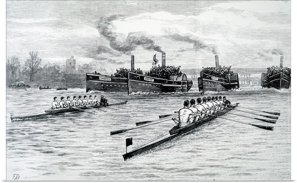 <p>Illustration depicting a scene from Cambridge and Oxford University Boat Race. Dated 19th century.</p>