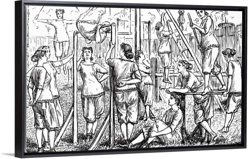 <p>Illustration depicting girls during a physical education class. Dated 19th century.</p>