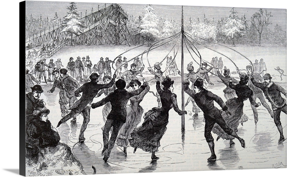 <p>Illustration depicting people skating on a frozen lake. Dated 19th century.</p>
