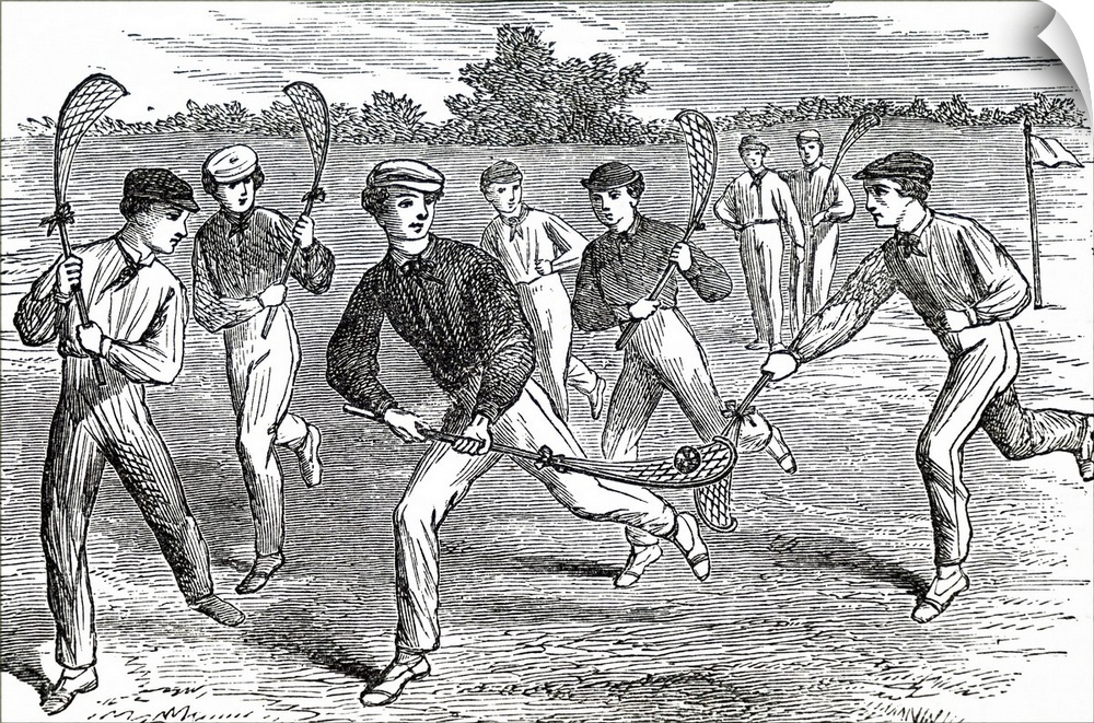<p>Illustration depicting young men playing lacrosse. Dated 19th century.</p>