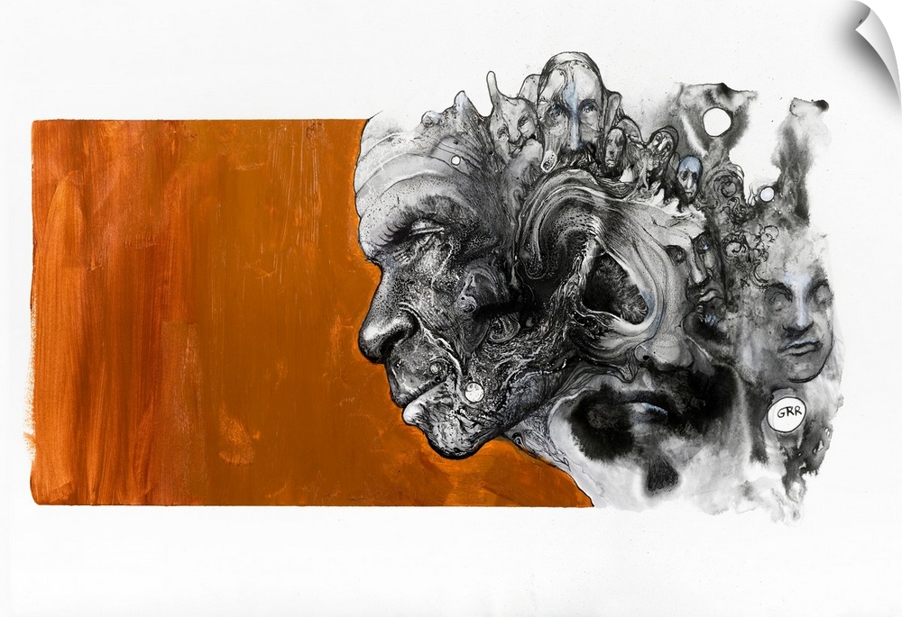 <p>Illustration Of A Male's Face In Profile With Numerous Other Human Faces Emerging From Behind The Head.</p>