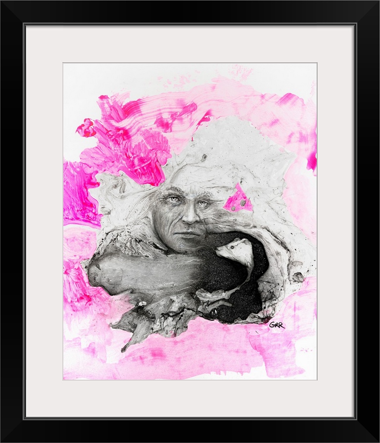 <p>Illustration of a man's face and a rat's head surrounded by pink and white brush patterns.</p>