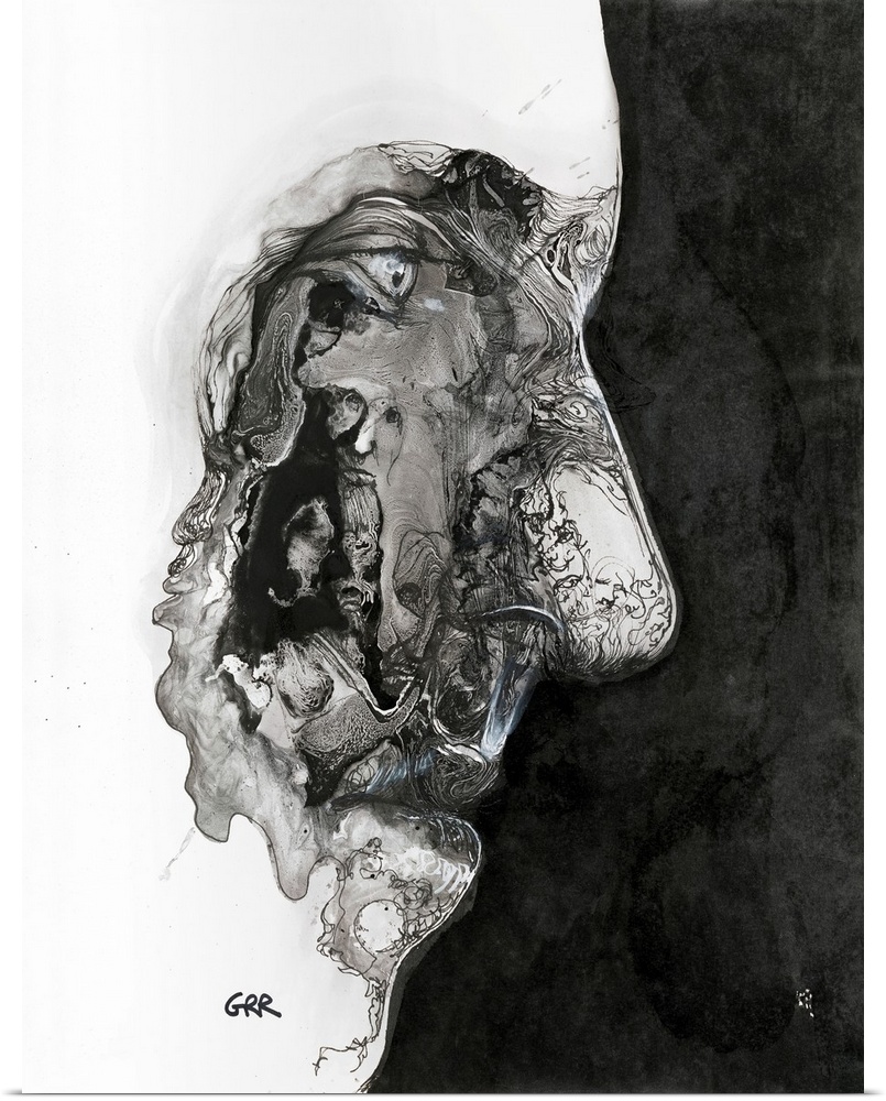 <p>Illustration of a man's face with smaller human faces inside the cheekbone.</p>