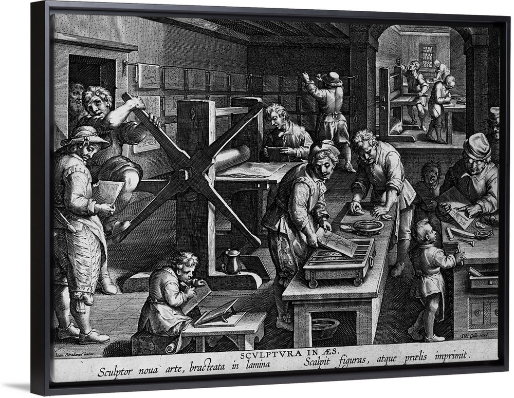 <p>Illustration of a 16th century printing shop showing engravers and hand-operated printing presses.</p>