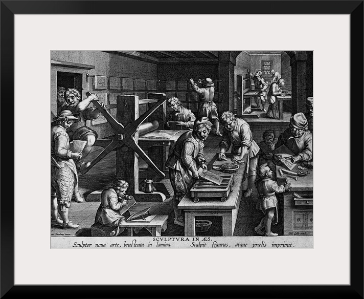 <p>Illustration of a 16th century printing shop showing engravers and hand-operated printing presses.</p>