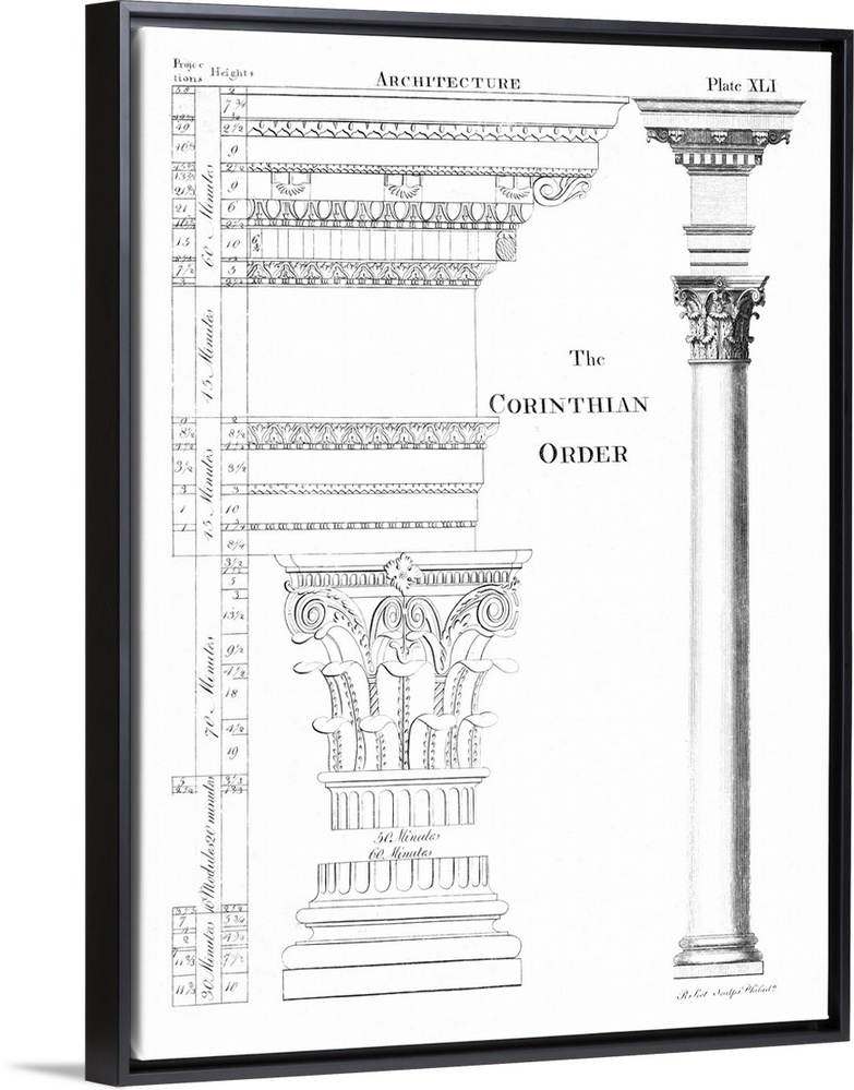 <p>An illustration of the Corinthian Order of Greek Columns. A whole column and a close-up diagram of the construction of the Corinthian columns. Undated illustration.</p>