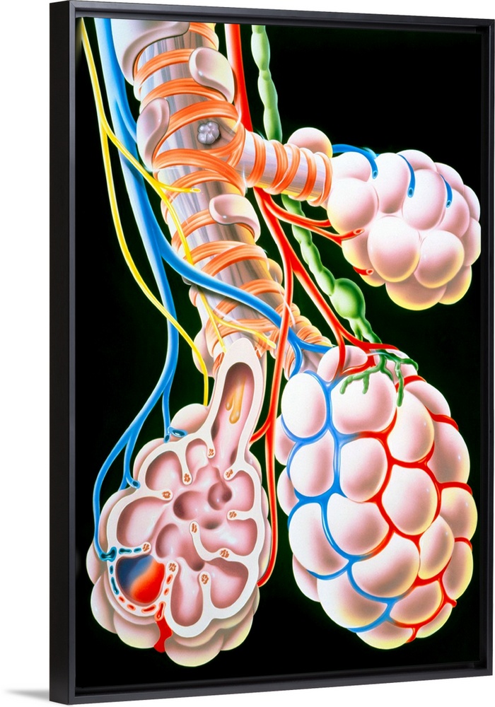 <p>Illustration of lung bronchioles and alveoli. The lung consists of many branched air passages called bronchioles (upper left), which end in groups of tiny balloon-like sacs called alveoli. It is in each alveolus that gases are exchanged during re- spiration. The bronchiole walls are lined spirally with smooth muscle (here, coloured orange). The alveolar sacs are thin-walled and supplied with a capillary network of blood vessels. Pulmonary veins (blue) bring deoxygenated blood to the lungs which is oxygenated by gas exchange across the alveolar walls (see lower left). Arteries (red) transport this oxygenated blood to the body. There are about 300 million alveoli in a human lung.</p>
