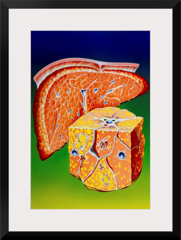 <p>Illustration of septal cirrhosis of the liver. Cirrhosis is a liver disease resulting in chronic damage to liver cells. Internal scarring divides the normal structure of the liver into nodules (in background diagram). Septa of fibrous scar tissue create islands of cells. Enlarged area shows heavy fat deposits (yellow) within these liver nodules. Because these nodules are inadequately supplied with blood, liver function is gradually impaired and toxic substances in the blood are no longer effectively removed. Heavy alcohol consumption is the most common cause of cirrhosis; a reduction in alcohol consumption can substantially improve the symptoms. Hepatitis can also lead to cirrhosis.</p>