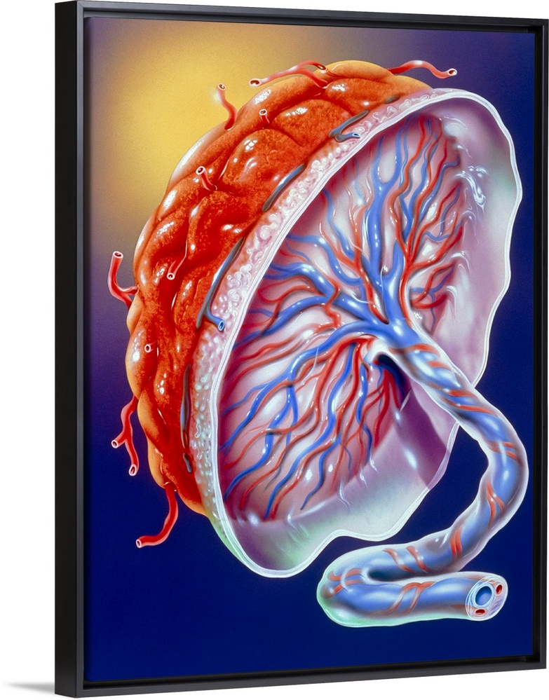<p>Illustration of the human placenta. The placenta is an organ that develops in the female uterus during pregnancy. Through it, and an umbilical cord (at lower right), the blood supply of the mother is linked to the fetus. A rich supply of placental blood vessels (red and blue, at centre) allow for nutrients and oxygen to be transferred from mother to fetus. And it allows waste products from the fetus to pass back to the mother. Apart from being a vital link between mother and fetus, the placenta also produces hormones. By the end of pregnancy it has grown about 20cm wide and 2.5cm thick. Shortly after birth, the placenta is expelled from the uterus as the afterbirth.</p>