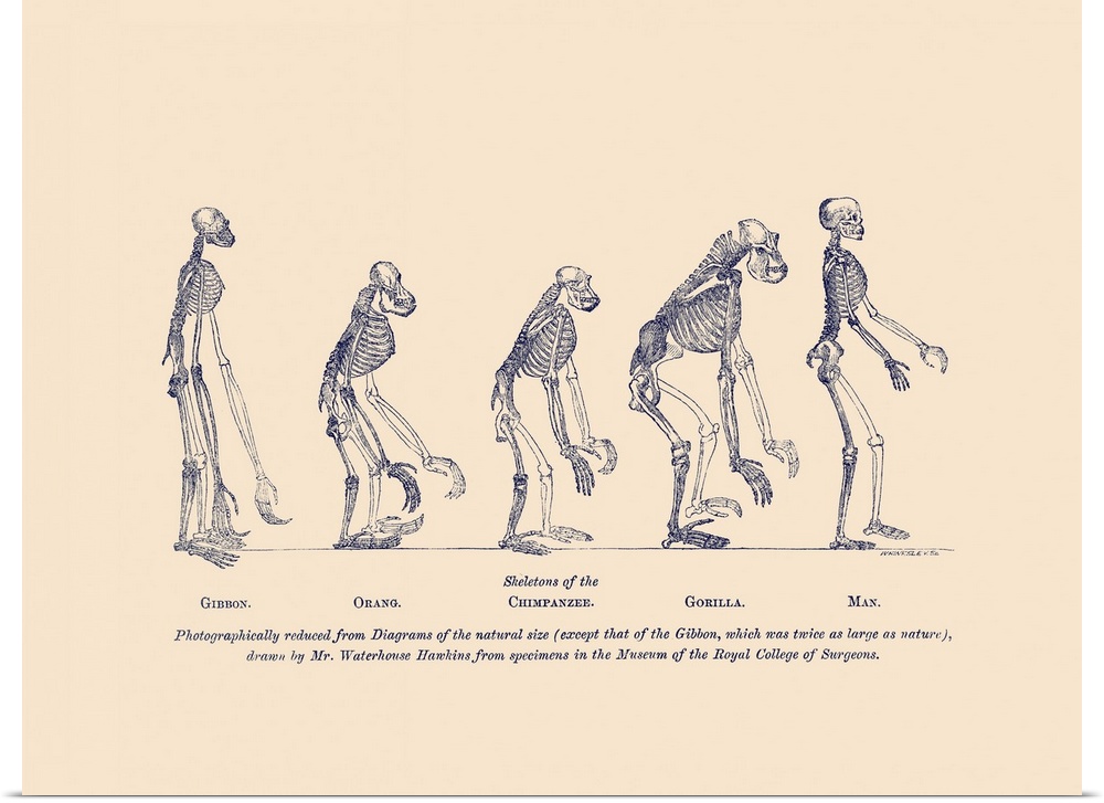<p>illustrations of comparative skeletons of the gibbon, orangutan, chimpanzee, gorilla and man.</p>