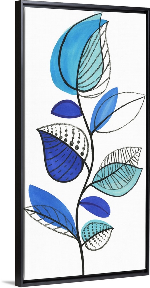 <p>A long vertical artwork of a branch of blue leaves outlined in black done in a modern design.</p>