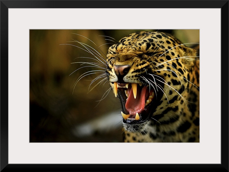 <p>Portrait of a leopard snarling.</p>