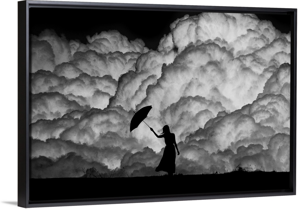 <p>Silhouette of a woman with an umbrella in front of huge storm clouds.</p>