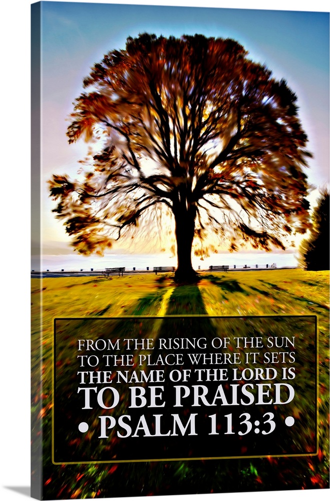 <p>Image Of A Backlit Tree In Autumn Against A Blue Sky With Scripture From Psalm 113:3</p>