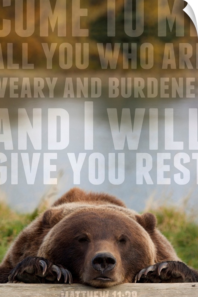 <p>Image Of A Bear Resting It's Head On A Log With A Scripture From Matthew 11:28</p>