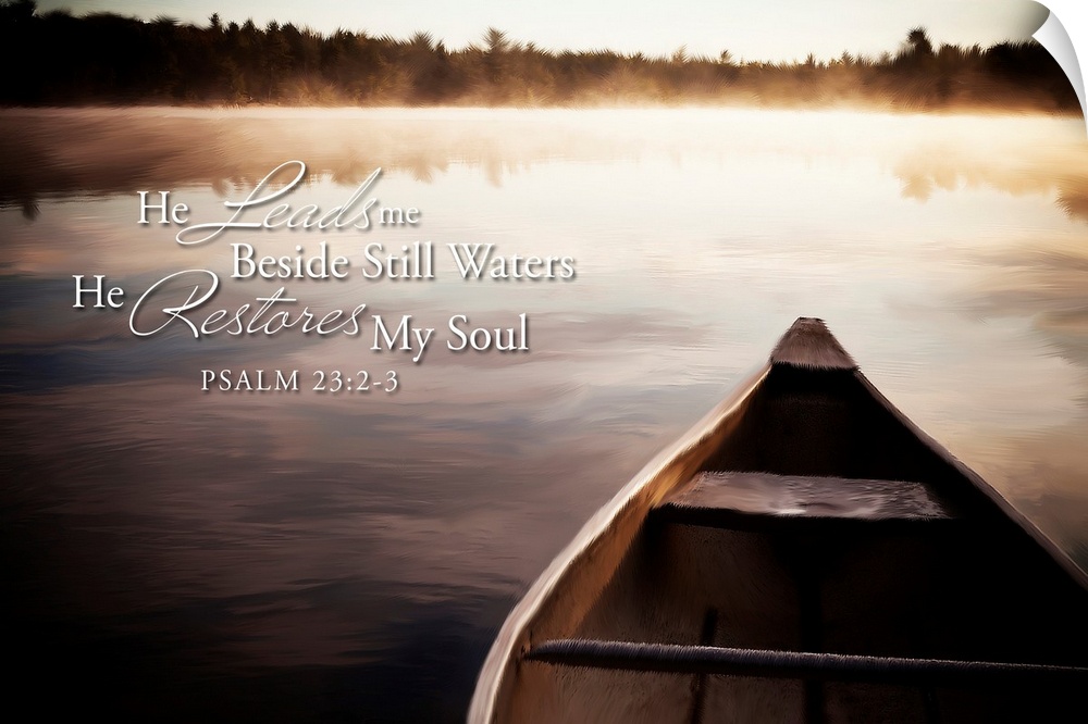 <p>Image Of A Canoe On A Tranquil Lake With Fog At Sunrise And Scripture From Psalm 23:2-3</p>