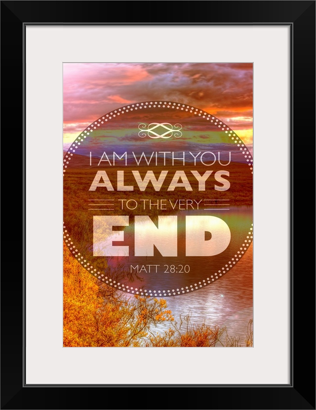 <p>Image Of A Colourful Sunset In A Cloudy Sky Reflected In A Tranquil Pond With A Scripture From Matthew 28:20</p>