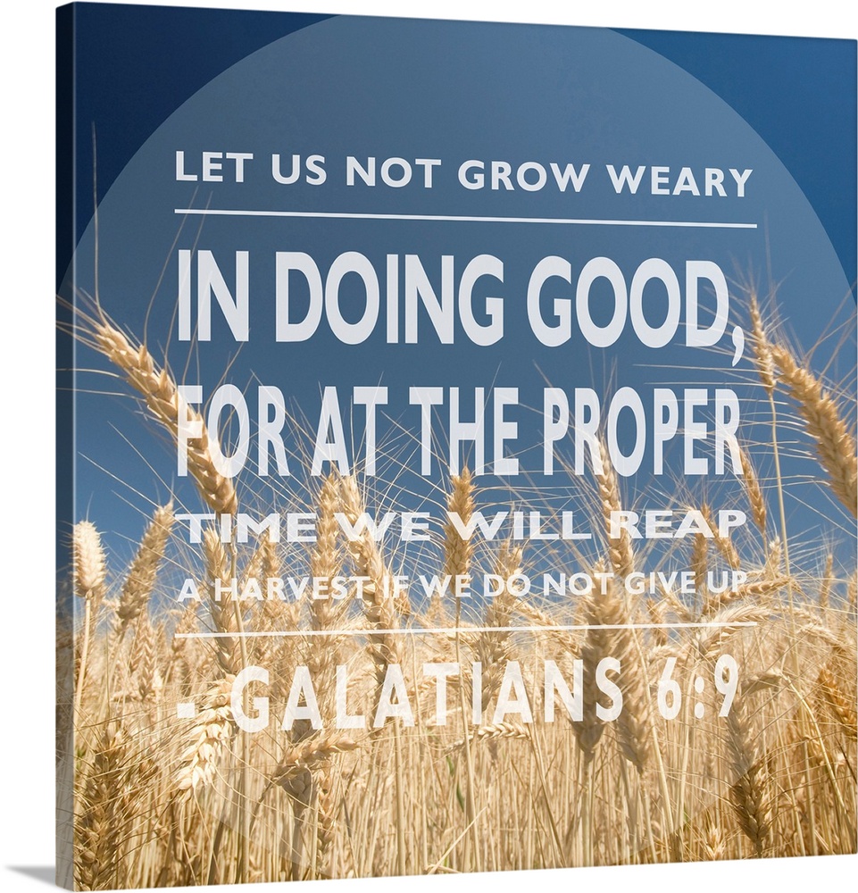 <p>Image Of A Grain Field Under A Blue Sky With A Scripture From Galatians 6:9</p>