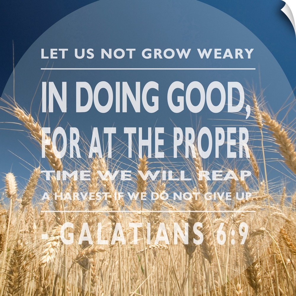 <p>Image Of A Grain Field Under A Blue Sky With A Scripture From Galatians 6:9</p>