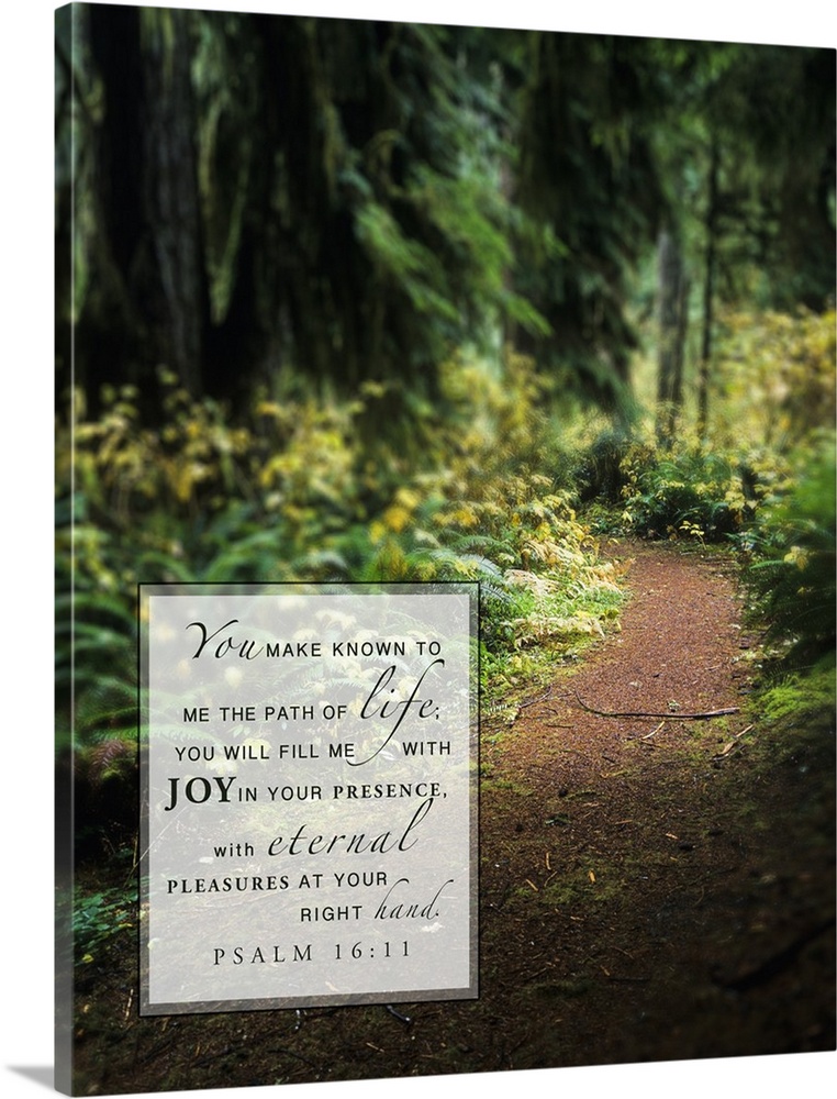 <p>Image Of A Trail Going Through A Lush Forest And Scripture From Psalm 16:11</p>