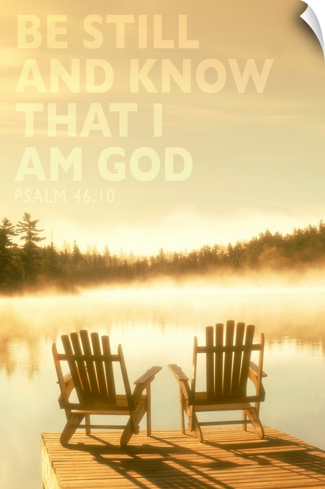 <p>Image Of Two Adirondack Chairs On A Wooden Dock In The Glowing Sunlight At Dawn With Fog Over The Lake And Scripture From Psalm 46:10</p>