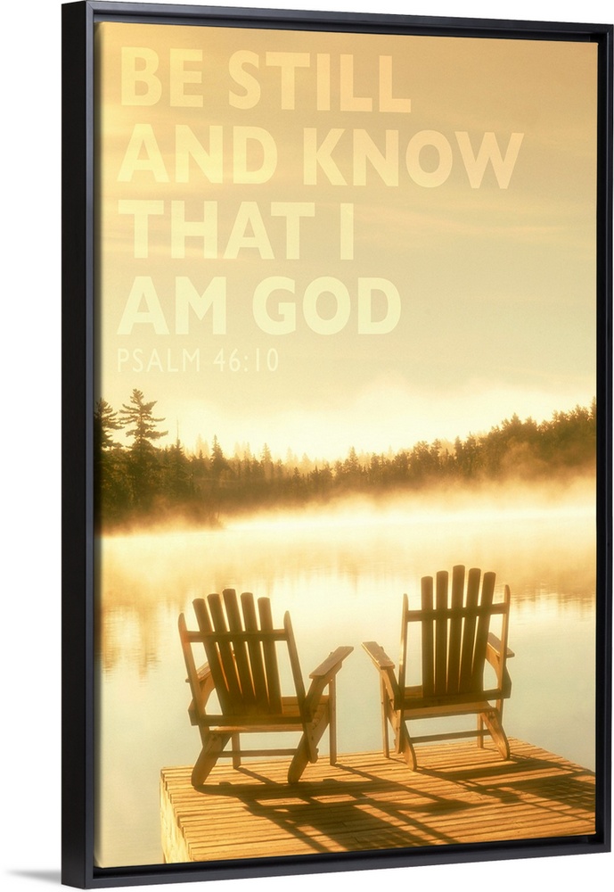 <p>Image Of Two Adirondack Chairs On A Wooden Dock In The Glowing Sunlight At Dawn With Fog Over The Lake And Scripture From Psalm 46:10</p>