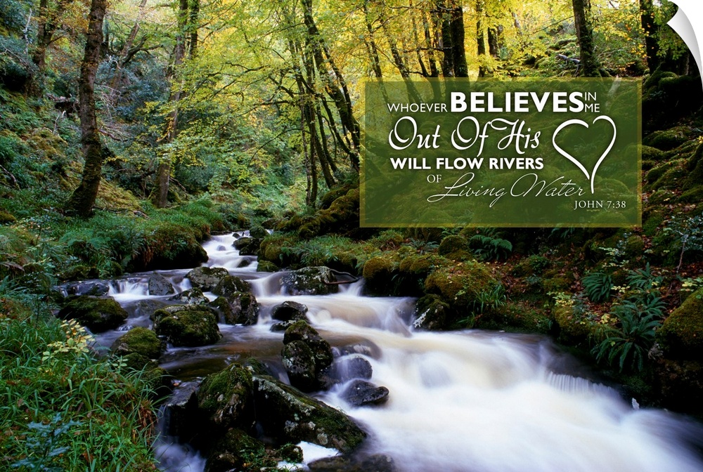 <p>Image Of Water Flowing Over Rocks In A Stream And A Lush Forest With A Scripture From John 7:38.</p>