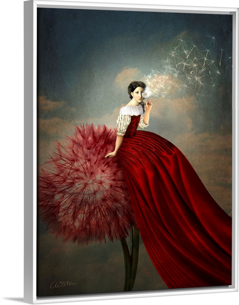 <p>A lady with a long red dress is sitting on a red dandelion.</p>