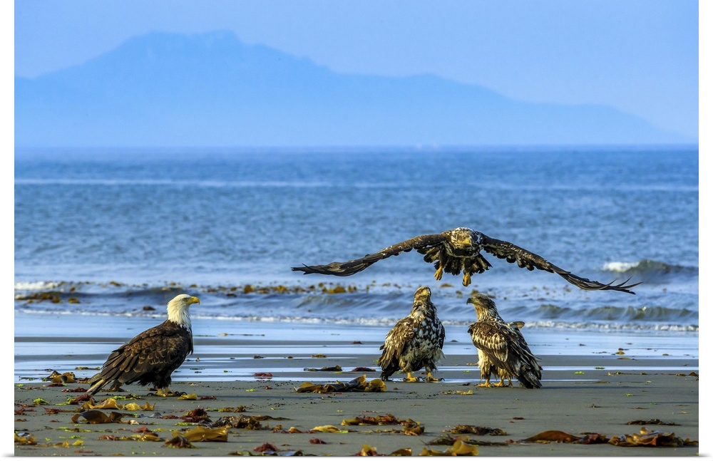 <p>Immature Bald Eagles, Haliaeetus leucocephalus, in flight fishing along the shoreline in Cook Inlet.</p>