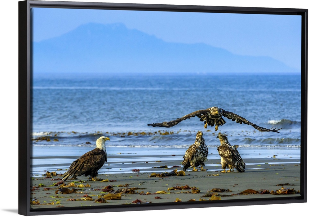 <p>Immature Bald Eagles, Haliaeetus leucocephalus, in flight fishing along the shoreline in Cook Inlet.</p>
