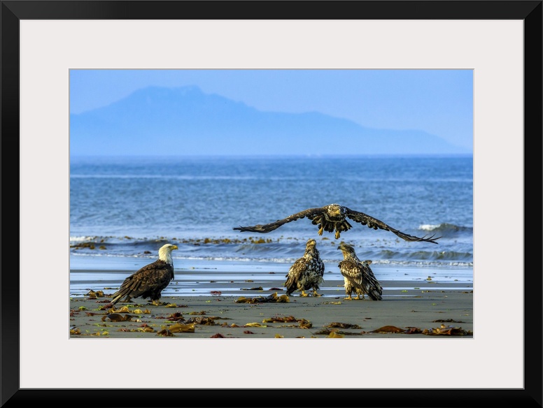 <p>Immature Bald Eagles, Haliaeetus leucocephalus, in flight fishing along the shoreline in Cook Inlet.</p>