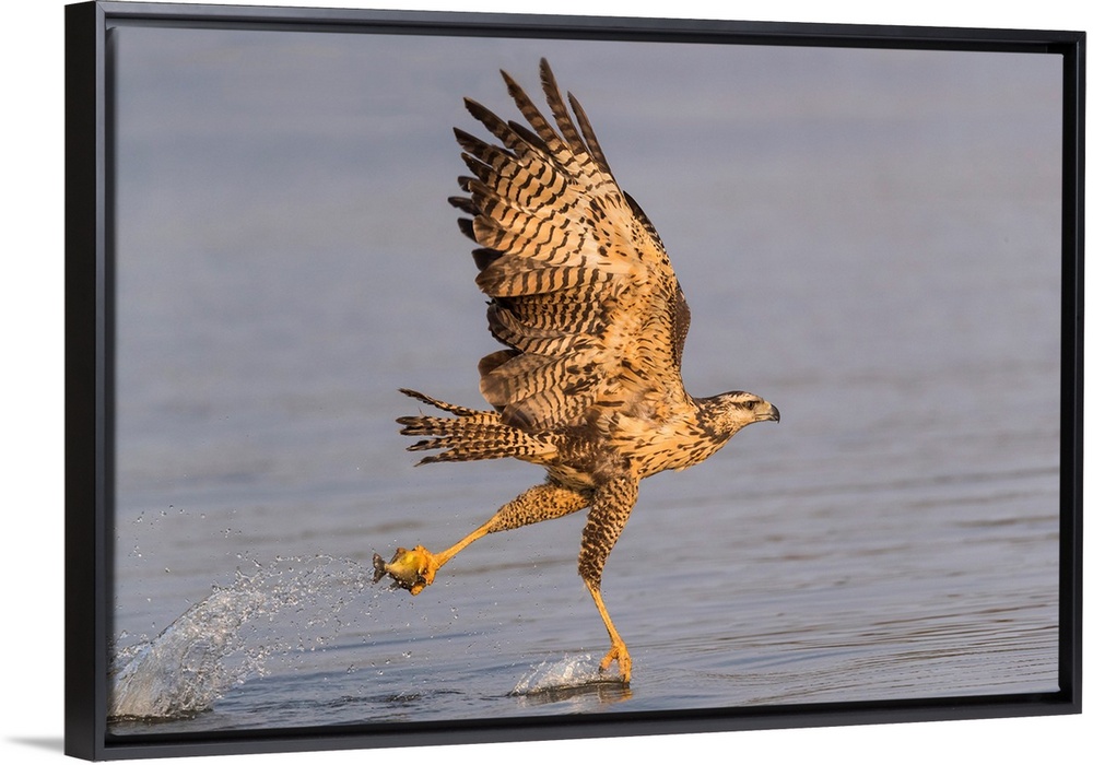 <p>South America, Brazil, The Pantanal, Rio Claro, immature great black hawk, Buteogallus urubitinga. Immature great black hawk flying in to snag a fish from the water of the Rio Claro.</p>