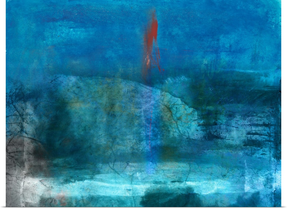 <p>Large blue abstract painting with green, black, gray, and white blending in on the background and a red mark towards the top.</p>
