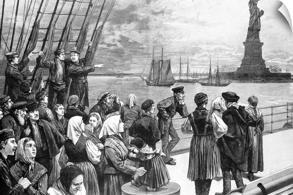 <p>Immigrants on the steerage deck of an ocean steamer passing the Statue of Liberty in New York Harbor. Engraving, 1887.</p>
